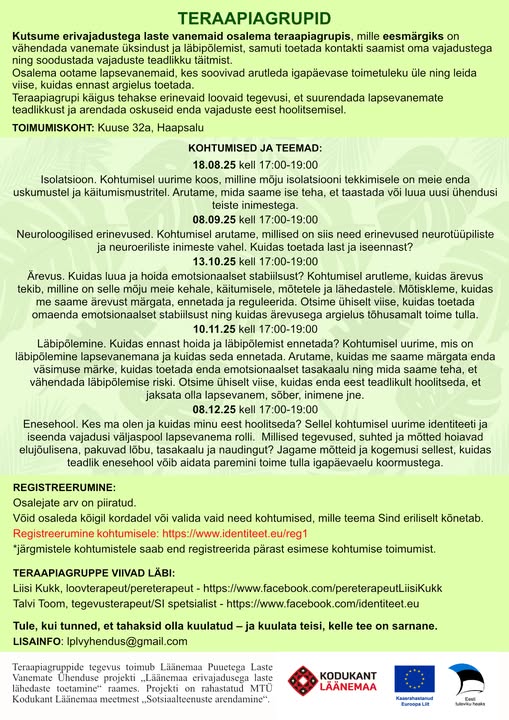 telefoni vahendusel. Haapsalus toimuvad nõustamispäevad Kastani 7, Läänemaa PIK-is.